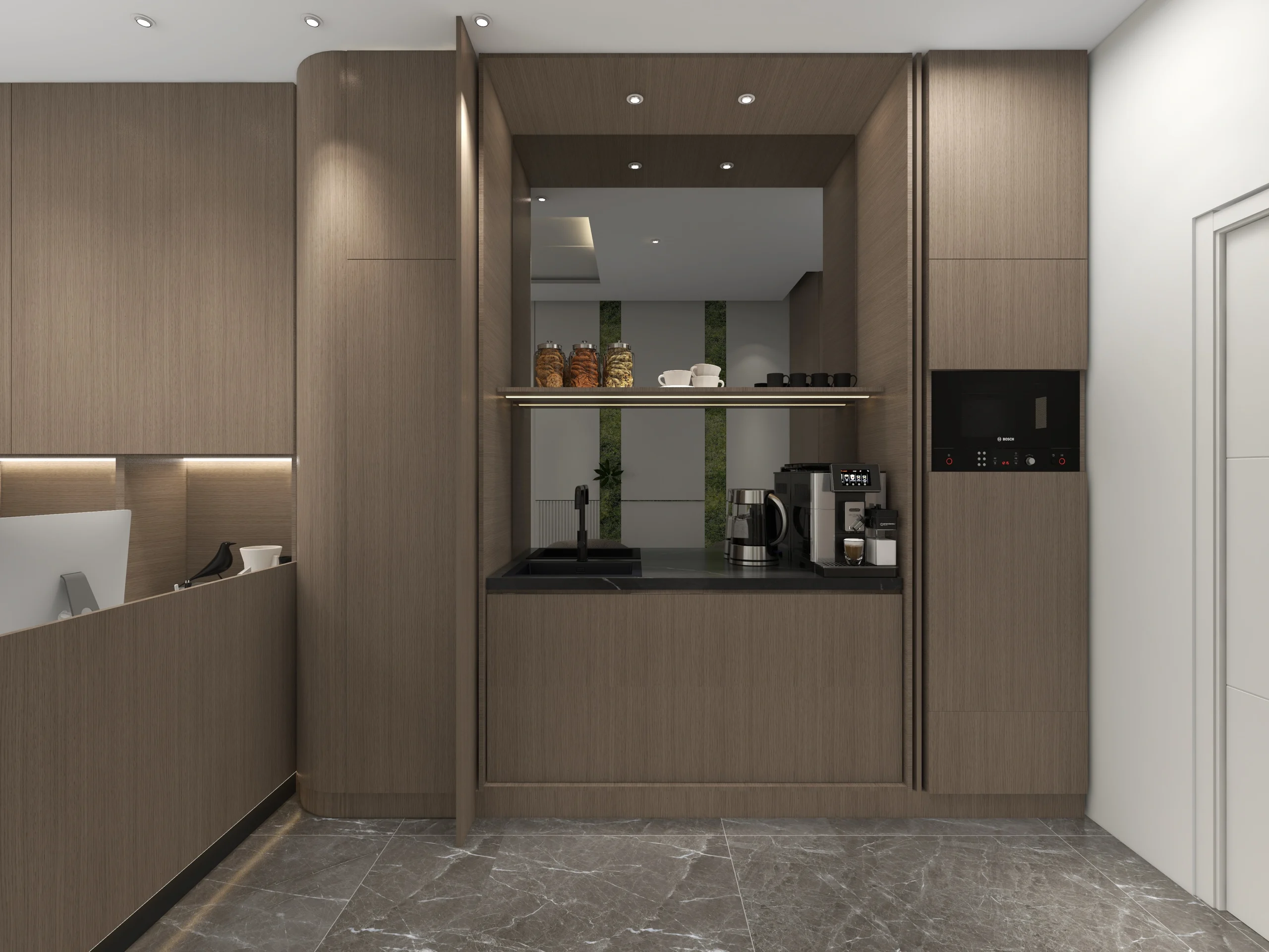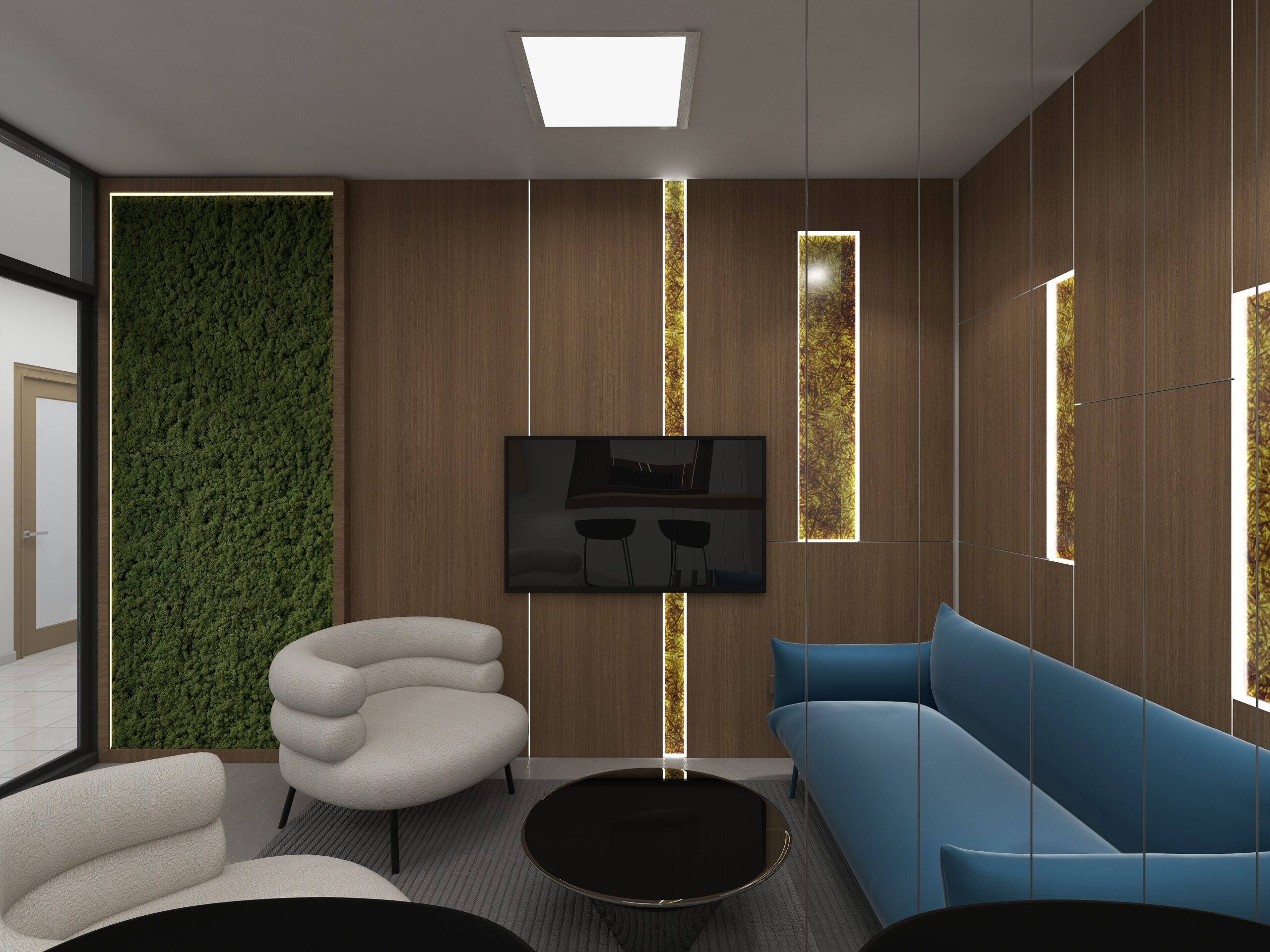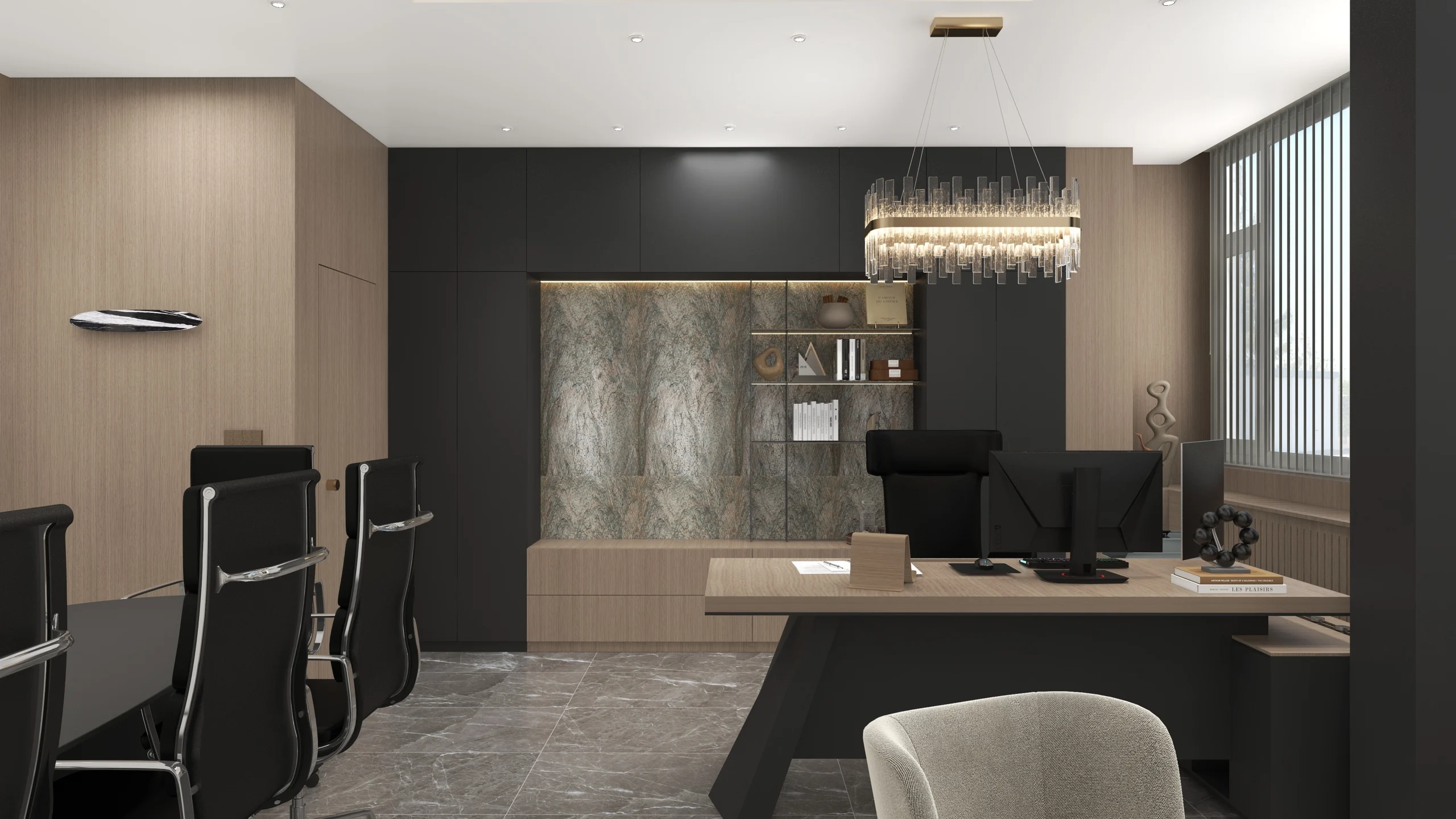 A Visonta Bánya projekt során teljes átalakítást terveztünk a vezetői és asszisztensi irodában. A két tér funkciójának és teljes belső designjának újragondolása volt a cél. A két iroda tervezésénél főbb szempont volt a tárolóhelyek maximalizálása, tágasabb terek és elkülönített funkciók kialakítása. Az asszisztensi irodában pocket door rendszerrel egy rejtett teakonyhát, 2-3 fő részére alkalmas váró részt, valamint egy teljes asszisztensi munkaállomást alakítottunk ki. Viszonylag kis térben kellett megoldanunk a vezetői irodai rész tárgyalói és konzultációs sarok kialakítását, mely során számos megrendelői igényt is kiszolgáltunk. A tárgyaló részen 8 fős tárgyalóasztal került betervezésre, ahol az üzleti megbeszélések során interaktív táblával megoldható az előadások vetítése és prezentációk bemutatása. A tárolóhelyeket maximalizálva rengeteg rejtett, beépített irattartó szekrényt egyedi falpanelekkel, elegáns sötétített üveg panelekkel és különböző textúrákkal kombináltunk. A moodboard meghatározó színei a sötétszürke, világosabb tölgy színek, melyhez a sötétített tükör, világos bézs falpanelek és kőfurnér burkolatok adják az iroda színeinek mélységét. Az irodát kényelmes munkaterület kialakítása, vezetői főasztalról vezérelhető kapcsolók, rejtett konnektorok teszik funkcionálissá. Ezt kiegészítve a térben egy falpanelekkel burkolt rejtett vezetői kabin is betervezésre került, mosdóval, öltözőszekrénnyel és rejtett italhűtővel.