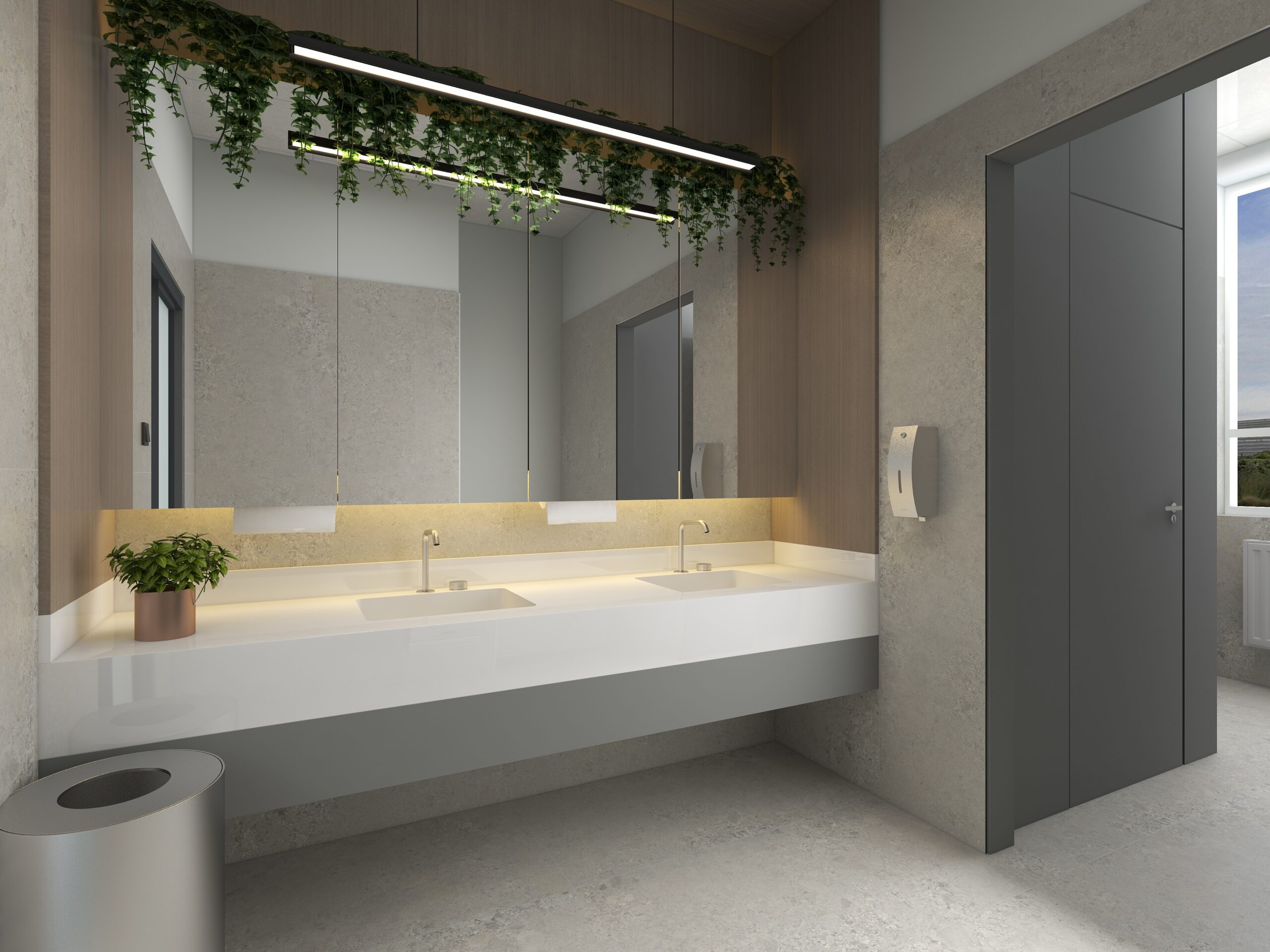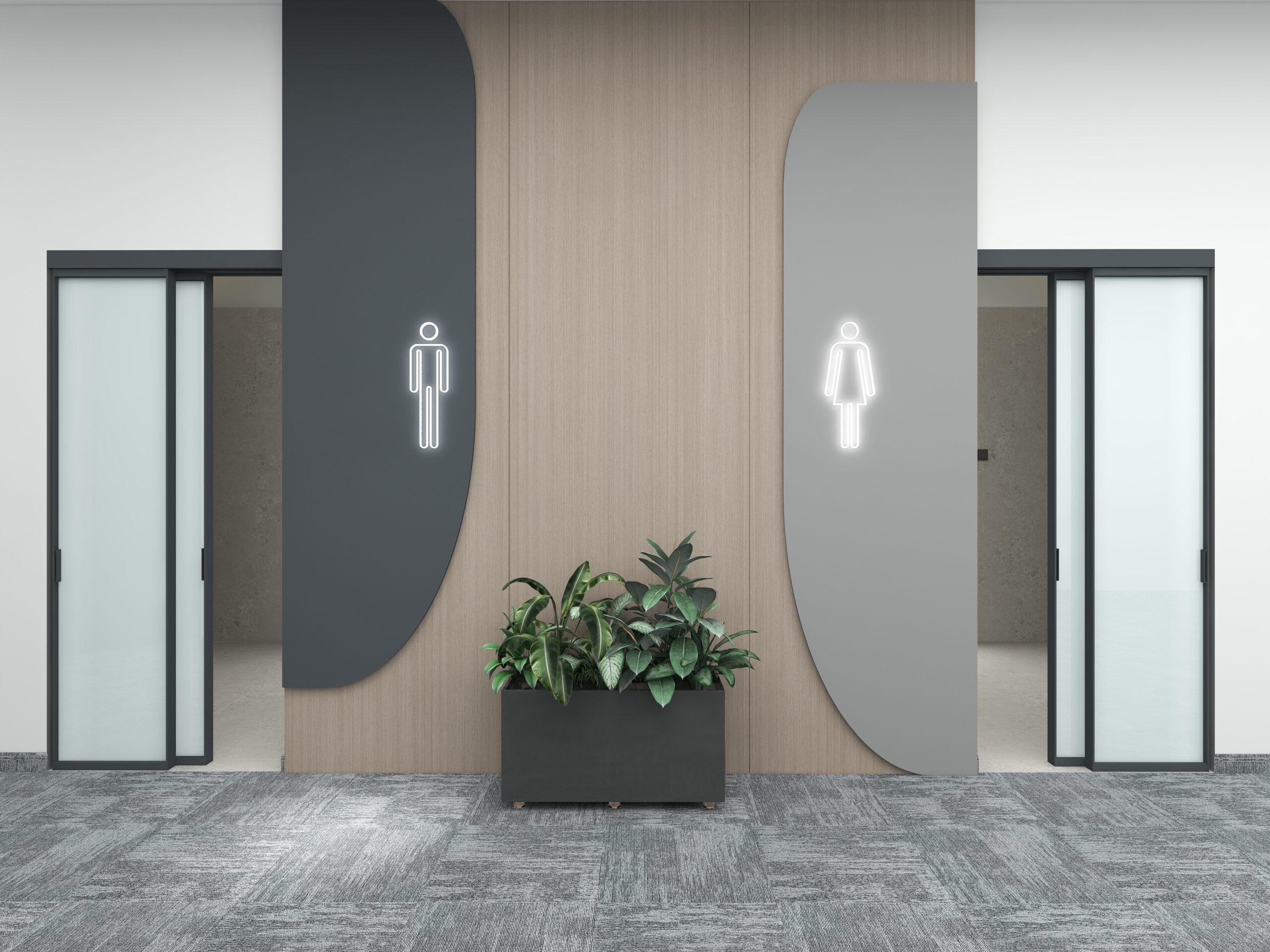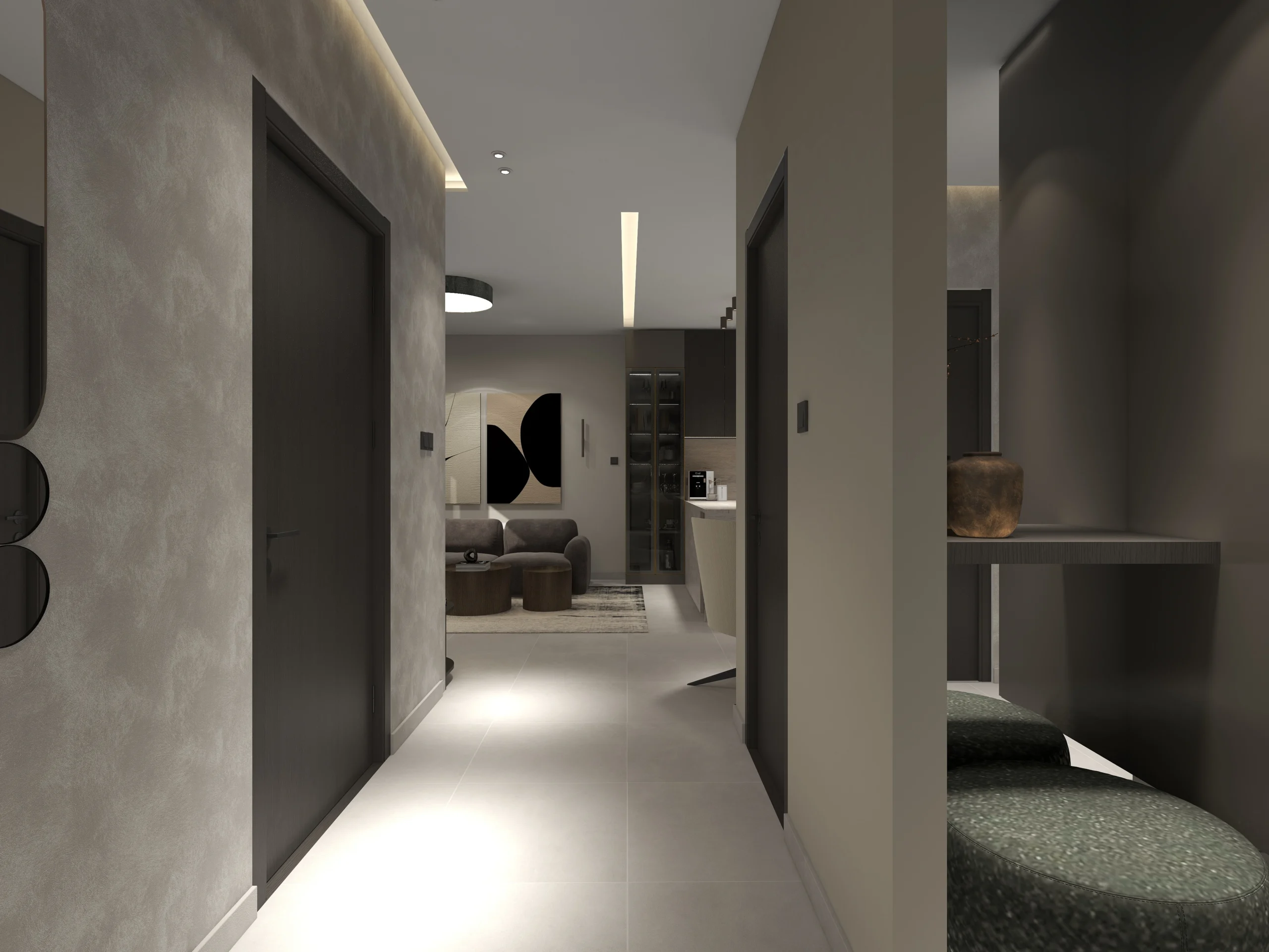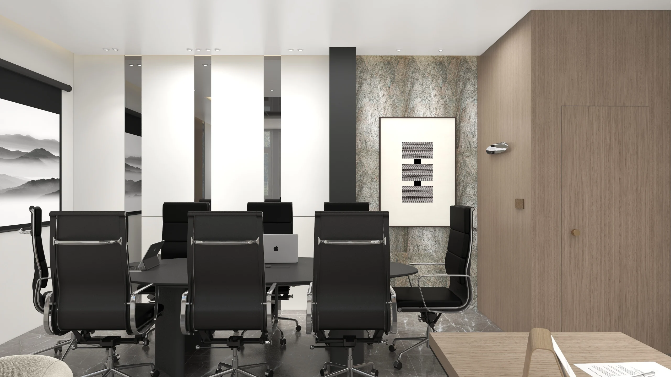 A Visonta Bánya projekt során teljes átalakítást terveztünk a vezetői és asszisztensi irodában. A két tér funkciójának és teljes belső designjának újragondolása volt a cél. A két iroda tervezésénél főbb szempont volt a tárolóhelyek maximalizálása, tágasabb terek és elkülönített funkciók kialakítása. Az asszisztensi irodában pocket door rendszerrel egy rejtett teakonyhát, 2-3 fő részére alkalmas váró részt, valamint egy teljes asszisztensi munkaállomást alakítottunk ki. Viszonylag kis térben kellett megoldanunk a vezetői irodai rész tárgyalói és konzultációs sarok kialakítását, mely során számos megrendelői igényt is kiszolgáltunk. A tárgyaló részen 8 fős tárgyalóasztal került betervezésre, ahol az üzleti megbeszélések során interaktív táblával megoldható az előadások vetítése és prezentációk bemutatása. A tárolóhelyeket maximalizálva rengeteg rejtett, beépített irattartó szekrényt egyedi falpanelekkel, elegáns sötétített üveg panelekkel és különböző textúrákkal kombináltunk. A moodboard meghatározó színei a sötétszürke, világosabb tölgy színek, melyhez a sötétített tükör, világos bézs falpanelek és kőfurnér burkolatok adják az iroda színeinek mélységét. Az irodát kényelmes munkaterület kialakítása, vezetői főasztalról vezérelhető kapcsolók, rejtett konnektorok teszik funkcionálissá. Ezt kiegészítve a térben egy falpanelekkel burkolt rejtett vezetői kabin is betervezésre került, mosdóval, öltözőszekrénnyel és rejtett italhűtővel.