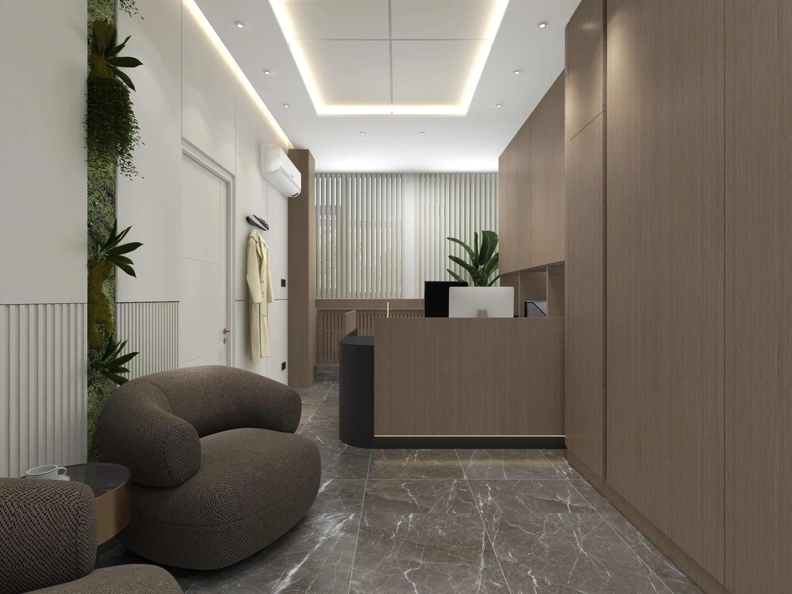 A projekt célja egy modern, dinamikus tér megalkotása volt, amely a funkcionalitást és az esztétikát egyensúlyba hozza. A központi elem a recepciós pult, amely nemcsak a belépő vendégek azonnali észlelését tette lehetővé, hanem a tér átláthatóságát is biztosítja, így a dolgozók folyamatosan kapcsolatban maradhatnak a látogatókkal. A beléptető rendszeren áthaladva egy üvegkabint alakítottunk ki, ahol a gyárba érkező vendégek kényelmesen felvehetik a szükséges védőfelszereléseket. A tér újragondolt elrendezése gondoskodott arról, hogy a gyári és irodai funkciók zavartalanul elkülönüljenek, biztosítva a zavartalan munkafolyamatokat. A projektben külön hangsúlyt fektettünk arra, hogy a tér minden egyes eleme a cég brandjéhez igazodjon, miközben modern, de barátságos atmoszférát biztosít. A földszinten két tárgyalót alakítottunk ki: a kisebbik üvegfalas megoldásának köszönhetően nemcsak a tér érzékelése, hanem a fényviszonyok is javultak, így kellemes, inspiráló környezetet teremtve a munkatársak és vendégek számára egyaránt. A zöld, fehér és szürke színek harmóniáját a növények és a világítás finoman hangsúlyozzák. Az interaktív, multifunkcionális tér segíti a hatékony munkavégzést, miközben inspiráló légkört biztosít, így a tér nemcsak vizuálisan, hanem érzelmileg is erős kapcsolatot teremt.